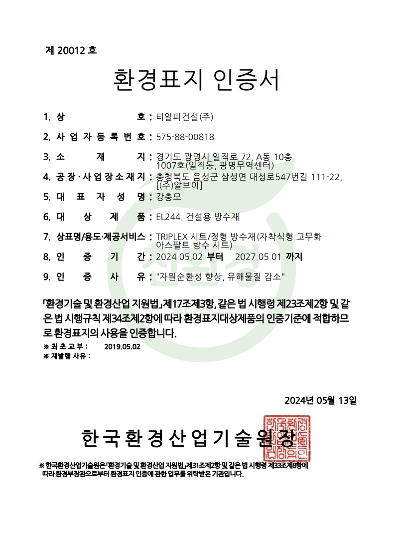 인증서 환경표지인증서 (TRIPLEX시트) 페이지 정보 목록 본문 환경표지인증서 (TRIPLEX시트) 이전글환경표지인증서(TRIPLEX 비노출우레탄) 25.06.24 다음글녹색기술인증서 GT-25-02288 25.06.24
