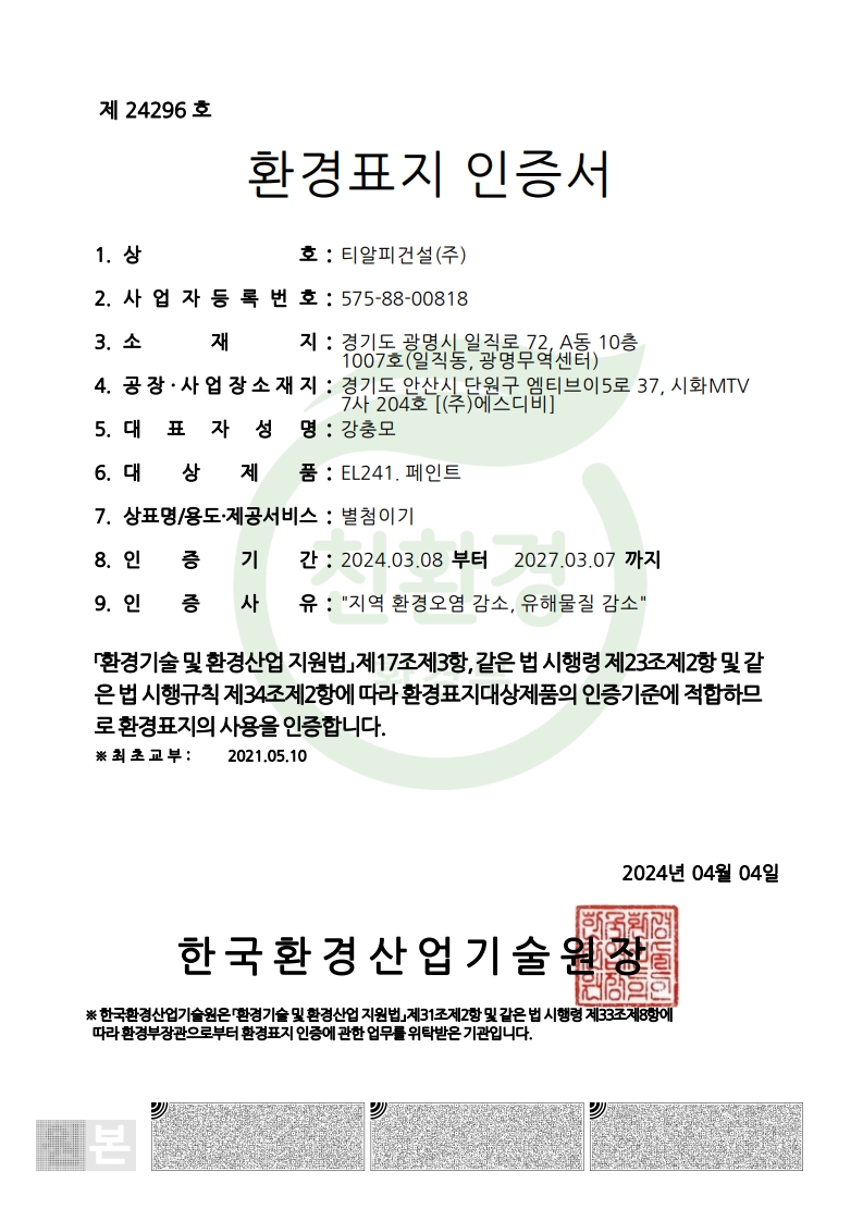 인증서 환경표지인증서(TRIPLEX노출우레탄) 페이지 정보 목록 본문 환경표지인증서(TRIPLEX노출우레탄) 이전글부착성능 및 인열성능이 향상된 폴리우레아 수지 도막방수재 25.06.24 다음글환경표지인증서(TRIPLEX 비노출우레탄) 25.06.24